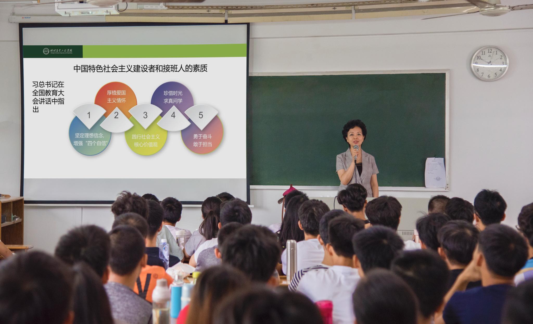 9月28日上午,学校校长程萍在海珠校区教学楼609课室为自动化专业2017级学生讲授本学期第一堂思政课。