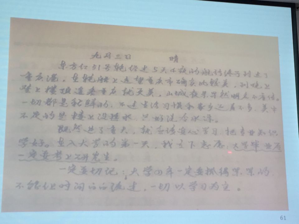 骆少明引用《大学》的开篇语“大学之道在明明德,在亲民,在止于至善”为本堂思政课作结,他期望同学们在大学期间能够明白道理,友好待人,提升个人修养。他还与大家分享了自己三十多年前上大学时写的日记,以自身经历激励青年学子,一定要珍惜大学时光,在一样的大学里成就不一样的人生。