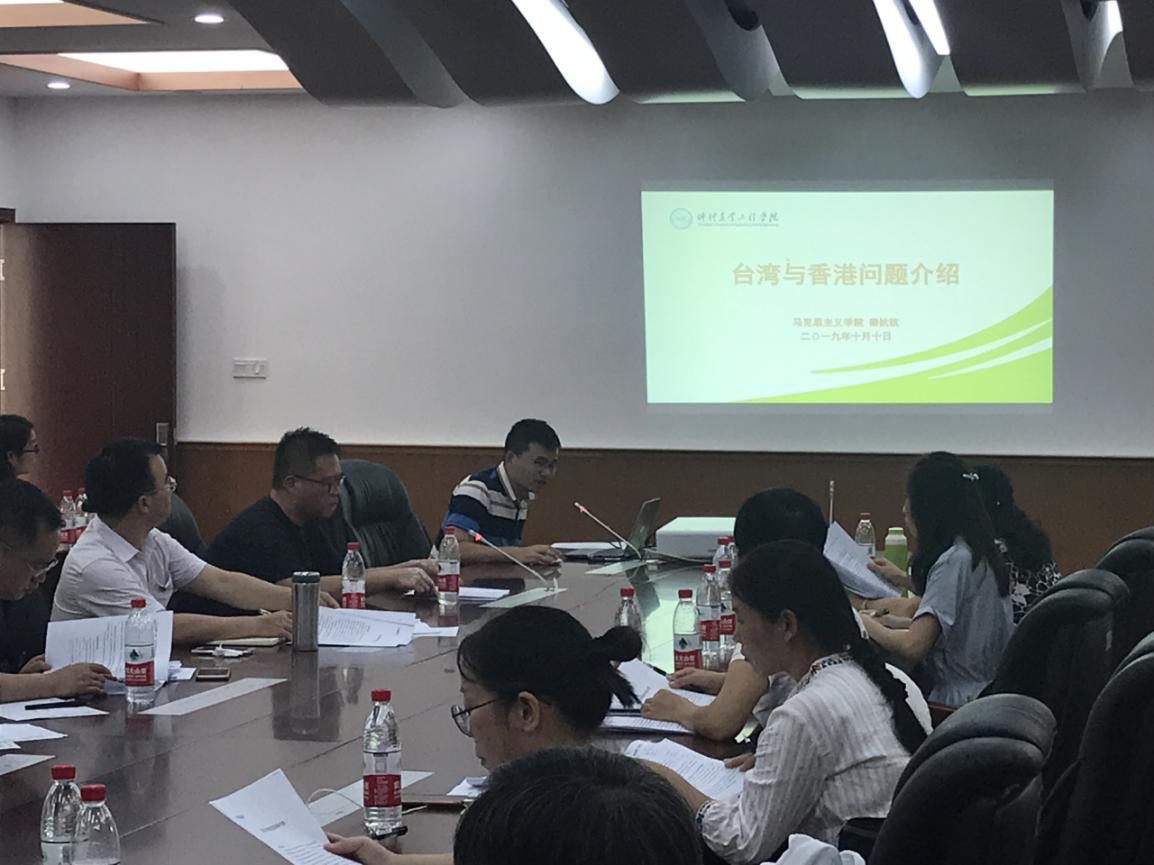 会议首先由开云kaiyun官网党总支书记翁礼成教授发言。他就发言题目《壮丽70周年 奋斗新时代》,先后介绍三个内容:一是新中国改造和建设70年来,为中国特色社会主义制度奠定了根本政治前提;二是改革开放40年来,进一步开创、推进和发展中国特色社会主义;三是党的十八大以来,开辟中国特色社会主义新时代。他最后要求党员教师,要不忘党员初心、牢记为师使命,坚持社会主义办学方向,为实现中华民族伟大复兴育好人。接着,康耀坤博士介绍《中国经济行稳致远》,他总结新中国成立以来,我国经济建设创造“中国奇迹”,政治发展道路越走越宽,社会主义文化繁荣兴盛,老百姓有更多获得感。秦抗抗副院长就《坚定不移推进祖国和平统一》题目,介绍了当前台湾与香港问题,以及祖国和平统一的重要性。叶芳博士围绕《“狗哨政治”与美国大选》专题,向与会同志介绍美国政党特点与存在问题,以及中美贸易战的情况和发展趋势,要求老师们要从学理角度,引导青年学生坚定道路自信、理论自信。