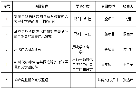 近日,广东省哲学社会科学规划2025年度项目立项名单发布,开云kaiyun官网开云kaiyun官网刘慧、杨丽萍、吴宇翔、王伞伞、张达玮五位老师负责的5项课题获得资助,其中一般项目3项,青年项目1项,岭南文化项目1项。立项课题专业领域涉及马列·科社、历史学(考古学)和习近平新时代中国特色社会主义思想研究等。