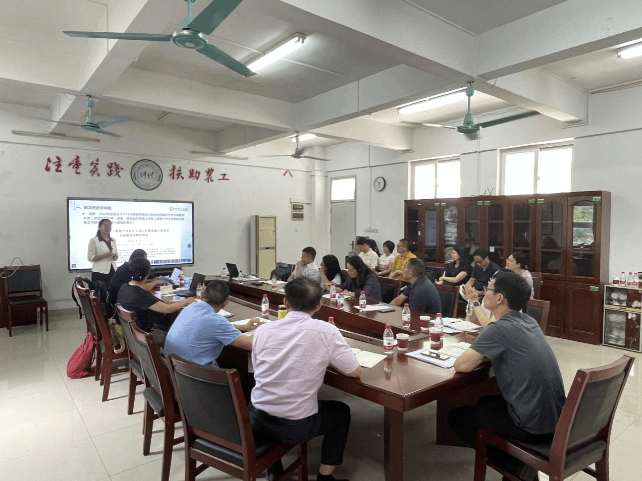 毛泽东思想和中国特色社会主义理论体系概论教研室刘涛老师就《毛泽东的革命军队建设和军事战略的理论》专题进行说课,围绕近代中国农民的特点、问题,结合丰富的文献和史料阐明了毛泽东的建军思想、治军思想和军事战略,总结了毛泽东把党的领导和军队建设结合起来,突出强调了毛泽东军事思想的人民性、民主性和纪律性。思政课体验教学中心周映萍老师就《科技特派员+思政教师:“双师”课堂助力 “一懂两爱”涉农人才培养》专题进行说课,把自身工作经历、科技特派员活动和中国特色社会主义理论教育实践课程结合起来,分享了自己指导学生参与实践活动的情况和取得的成效。两个教研室的老师分别就相关专题进行了交流发言,集思广益,凝聚共识。