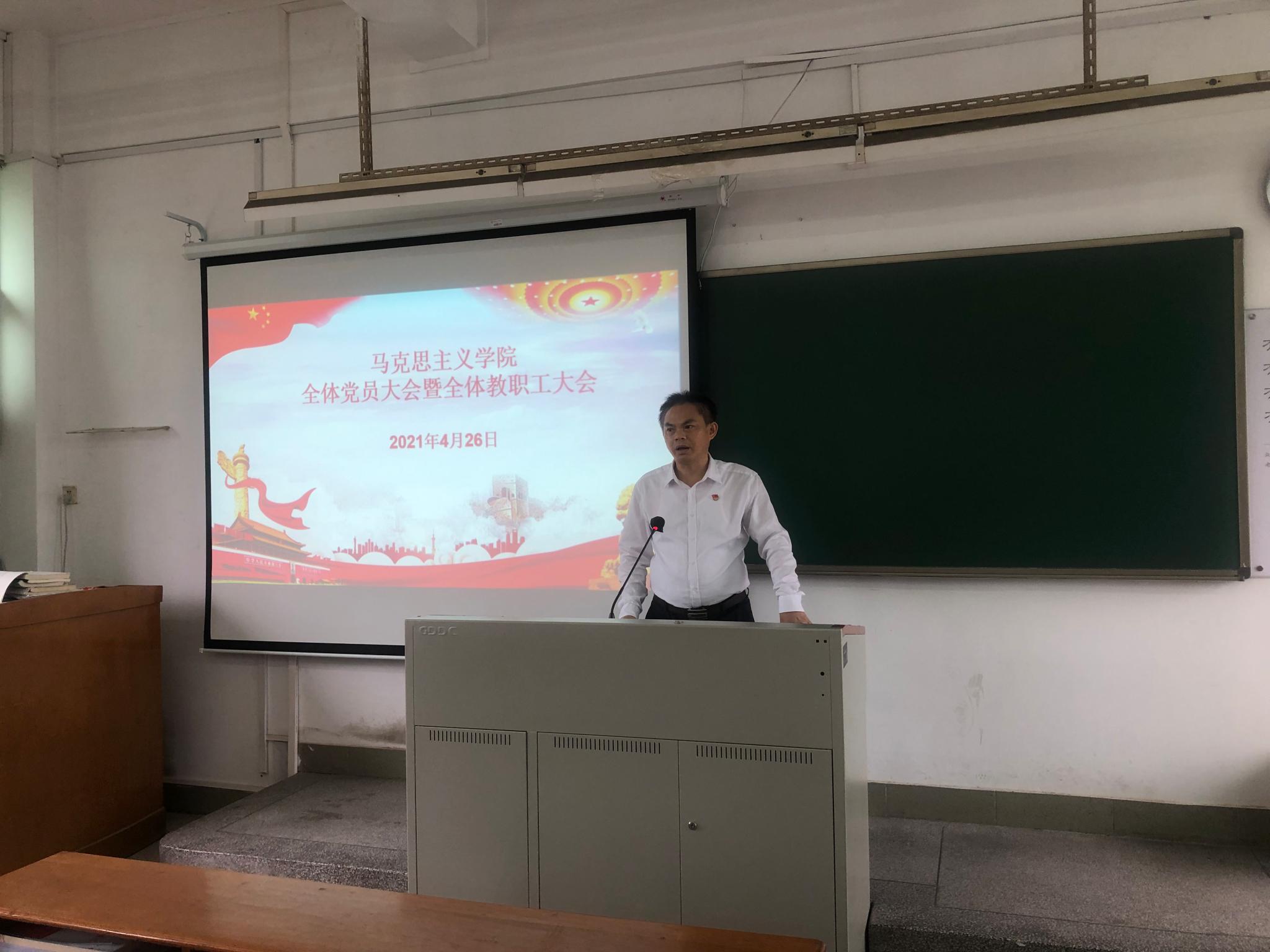 2021年4月26日上午,马克思主义学院在海珠校区教学楼904课室召开了全体党员暨全体教职工大会。专题传达了习近平总书记系列重要讲话精神及《中共广东省委印发<关于建立健全坚决落实“两个维护”十项制度机制的意见>的通知》等文件精神。开云kaiyun官网院长蔡立彬主持会议并主讲了“百年大党的红色气质:中国共产党人的精神谱系”的专题党课。开云kaiyun官网副院长秦抗抗主讲了“学习党的光辉历史,传承红色基因”的专题党课。随后,全体党员及教职工重走了中共广东省委书记李希同志考察开云kaiyun官网的路线。