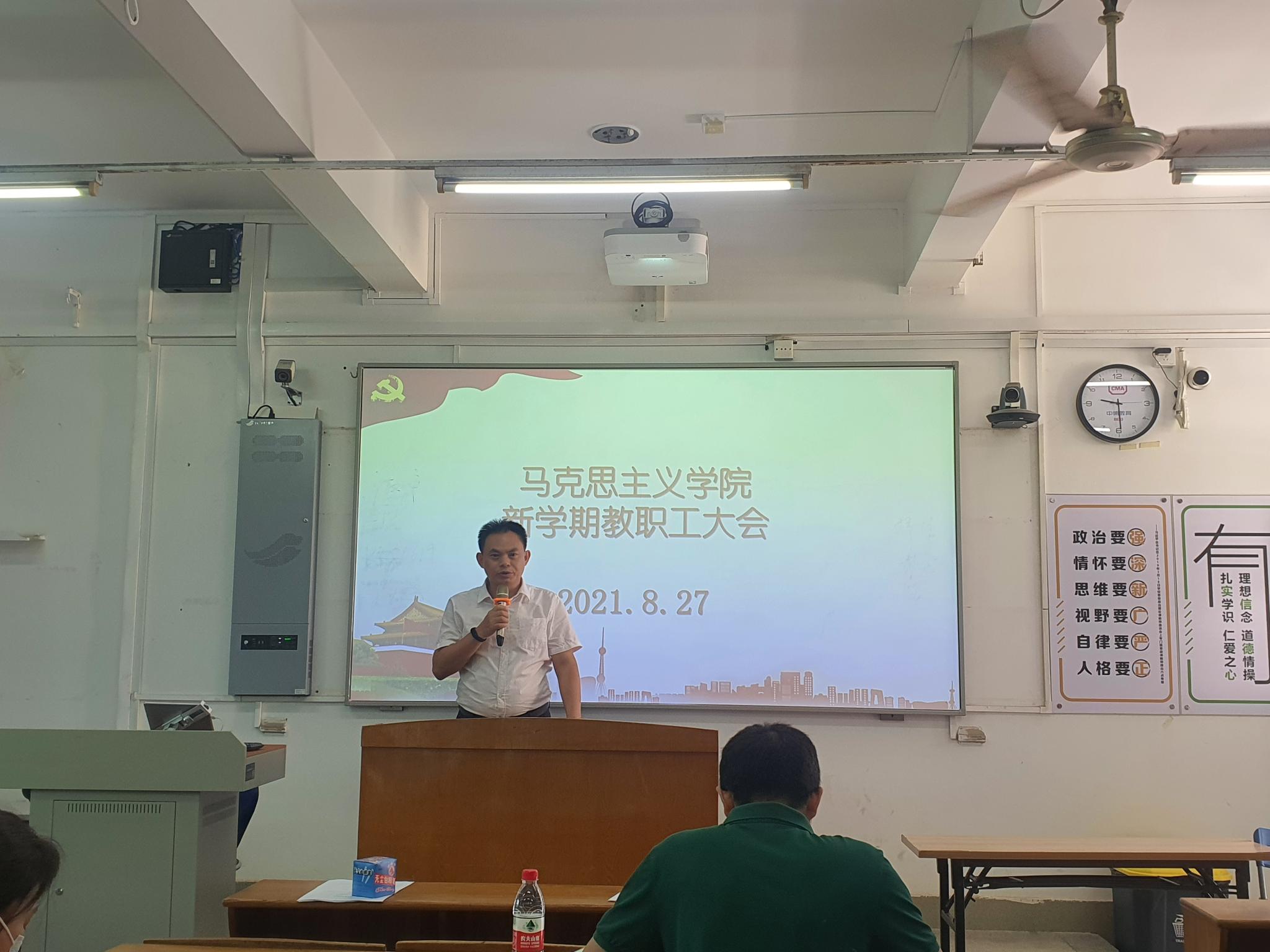 全体教职工大会上,蔡院长首先向大家传达了近期学校召开的几场工作会议精神,并对重点部分进行了解读。然后,蔡院长对学期初的各项工作做出具体的安排:第一要不断提高政治站位,认真做好疫情下的开学准备工作,做好两周甚至一个月的线上教学的预案;第二要狠下功夫,不断提高教学质量和水平,着力打造“理论有深度、情感有温度、实践有力度”的高质量思政金课;第三部署了2021年学院纪律教育月活动,并就当前深入开展党史学习教育做了安排;第四部署了下半年学院主要的行政工作,提出要努力完成今年人才招聘任务。