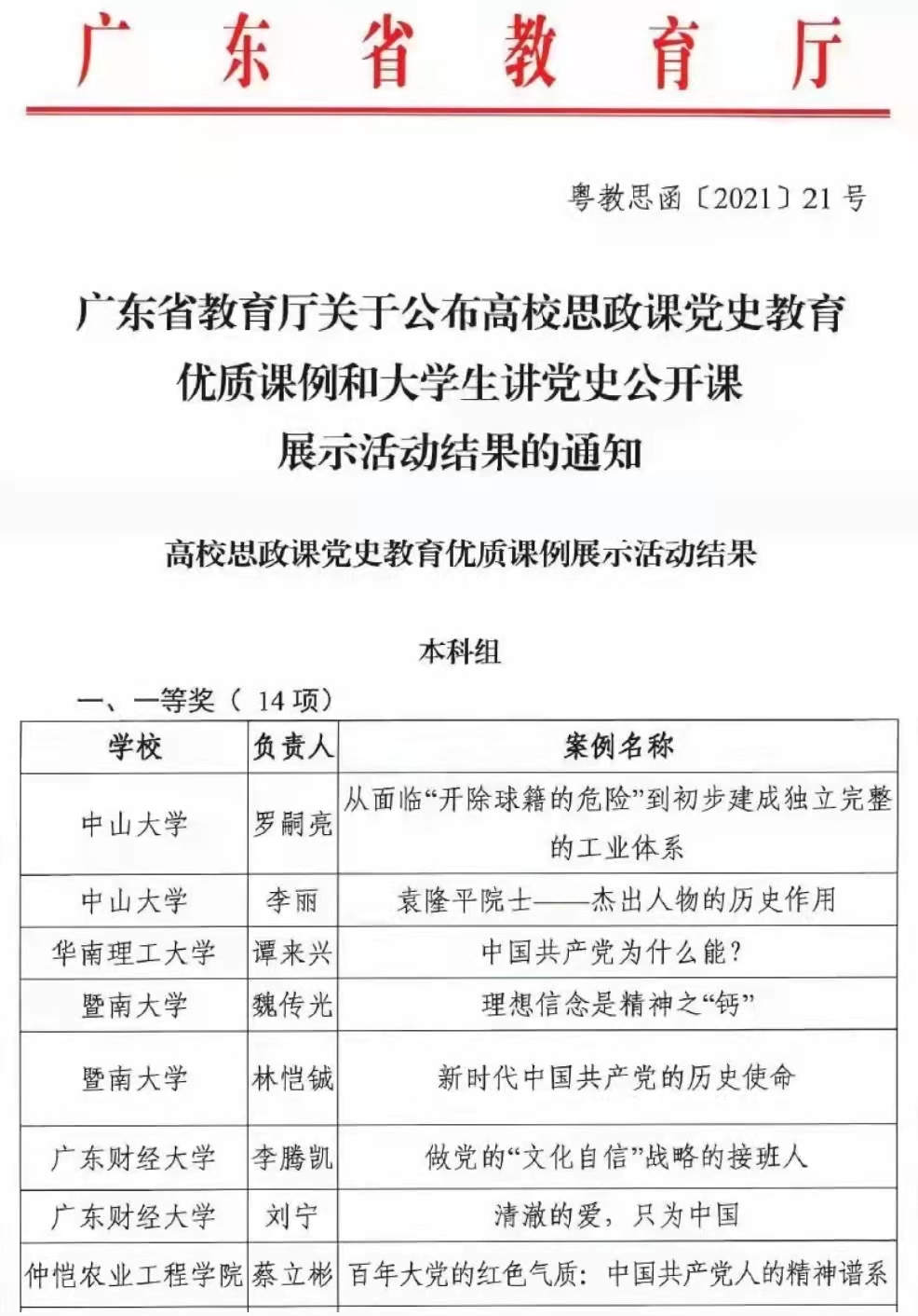 10月21日,广东省教育厅印发了《关于公布高校思政课党史教育优质课例和大学生讲党史公开课展示活动结果的通知》(粤教思函[2021]21号),正式公布了广东省高校思政课党史教育优质课例和大学生讲党史公开课展示活动结果获奖名单。其中,高校思政课党史教育优质课例一等奖29项、二等奖50项、三等奖80项。经各高校推荐和组织专家评审,我校开云kaiyun官网蔡立彬老师提交的课例《百年大党的红色气质:中国共产党人的精神谱系》喜获一等奖。