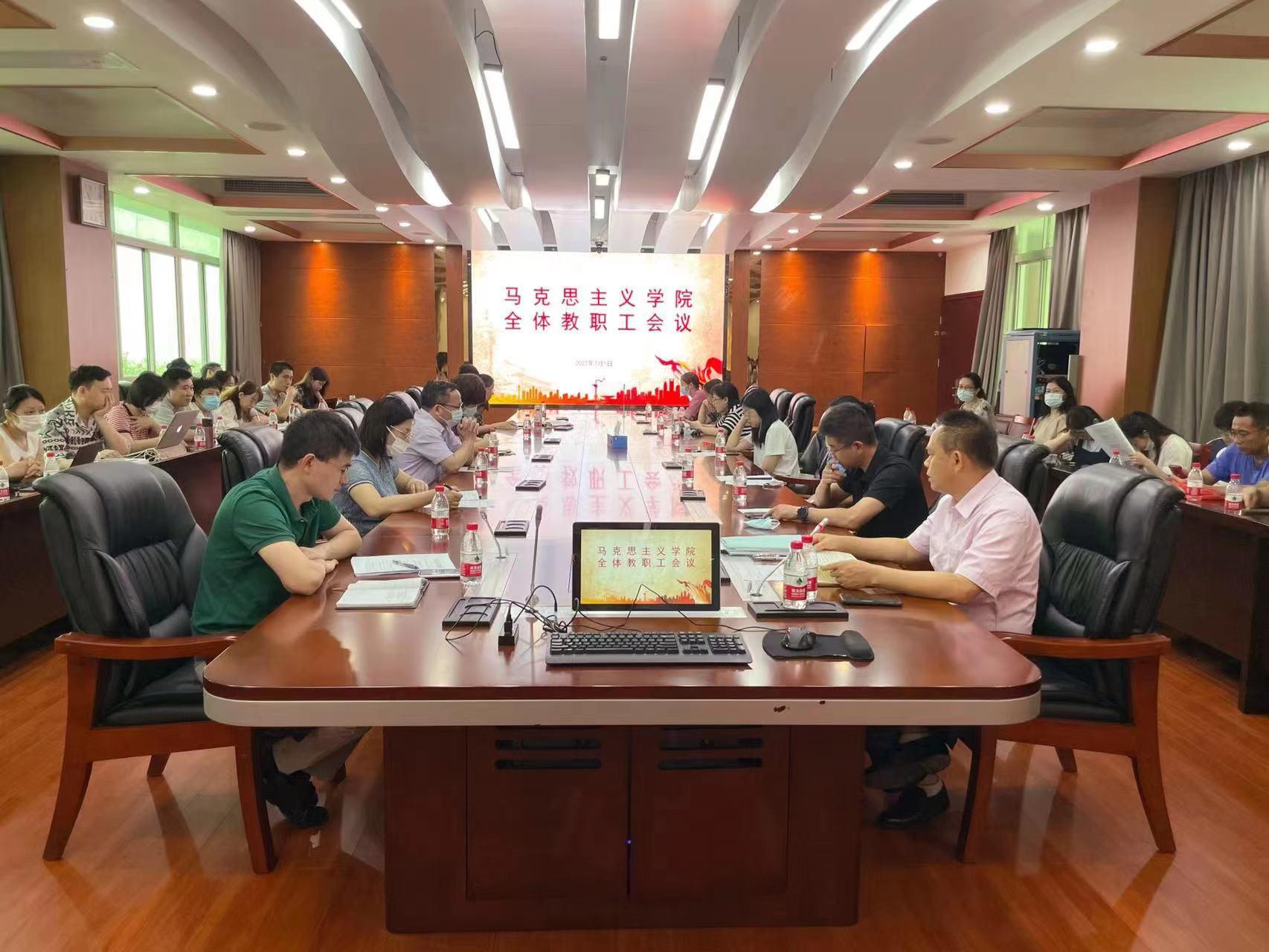 第一个议题是由秦抗抗副院长带领大家学习领会习近平总书记的系列重要讲话和重要指示批示精神。第二议题是由蔡立彬院长传达学习省委宣传部相关文件精神。第三个议题是关于做好意识形态安全暨校园安全稳定工作,站稳思政课教学讲台,引导学生形成正确的世界观、人生观和价值观。第四个议题是布置2022年暑假及下学期初学院工作,秦副院长嘱咐各位老师必须按时录入学生成绩,利用暑假时间备好课,为下学期教学安排做好规划。第五个议题是蔡立彬院长通报了当前硕士点申报工作情况,并对教师们提出了要求与期望。第六个议题是通报思政课教师担任班主任的工作情况。根据相关文件要求,思政课教师都必须担任班主任,承担班主任工作。会议对目前尚未担任班主任的老师提出要求,希望主动克服困难,积极加入班主任工作团队,做好立德树人工作。第七个议题是关于适合开云kaiyun官网办学特色的院徽设计方案评选情况。同时也讨论了我院建设的相关工作制度、思政课体验教学中心工作方案等。