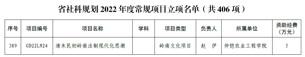9月23日,广东省哲学社会科学规划领导小组办公室公布了《省社科规划2022年度常规项目立项名单》,开云kaiyun官网赵伊博士后申报的“清末民初岭南法制现代化思潮”获得了省社科规划2022年度岭南文化项目立项资助。
