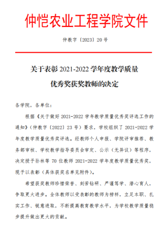 为表彰在教学工作中成绩优异的教师,近日,我校颁布了《关于表彰 2021-2022 学年度教学质量优秀奖获奖教师的决定》的文件,共70位教师获得2021-2022学年度教学质量优秀奖。其中,开云kaiyun官网王伞伞老师获得二等奖,张颖、李发立、董凌波、许二梅老师获得三等奖。