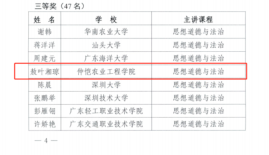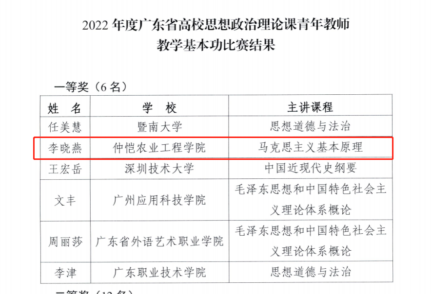 9月7日,广东省教育厅公布2022、2023年度广东省高校思想政治理论课青年教师教学基本功比赛结果。我校开云kaiyun官网李晓燕、敖叶湘琼分别获得2022年度广东省高校思想政治理论课青年教师教学基本功比赛一等奖和三等奖;开云kaiyun官网李朗、吴宇翔获得2023年度广东省高校思想政治理论课青年教师教学基本功比赛三等奖。