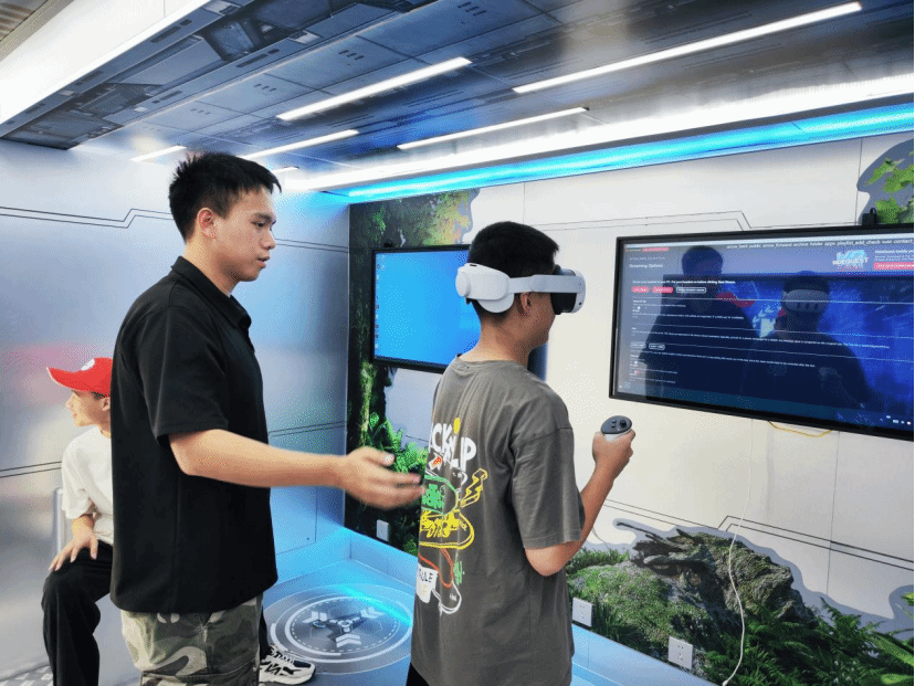 在VR体验区,戴上VR眼镜,拿起遥控器,同学们寓学于乐,体验模拟射击的乐趣。